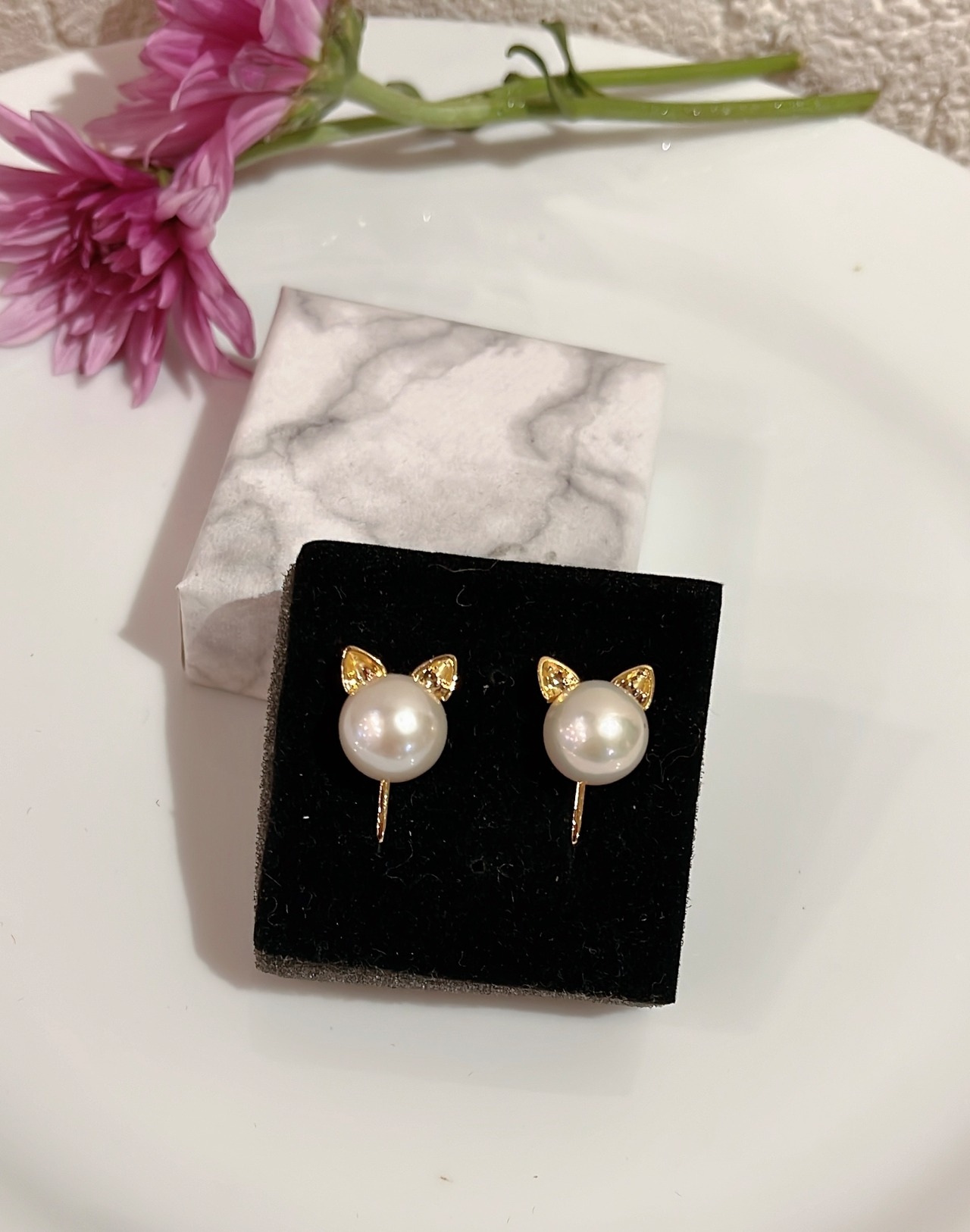 ころんとした淡水パールに、きらっと輝くゴールドカラーのねこ耳がアクセント。