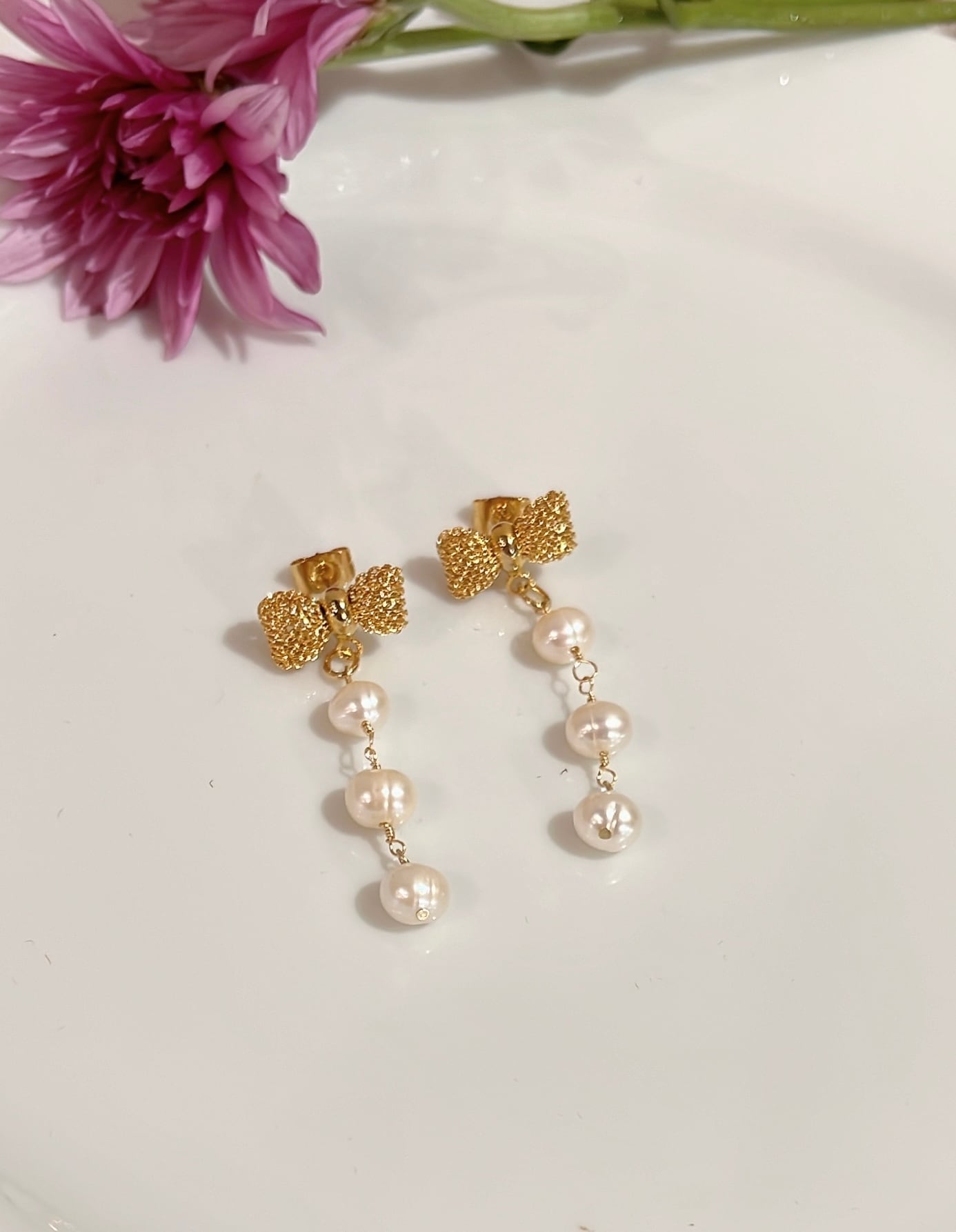 リボン3連ピアス|Celemilly(セレミリー)|淡水パール | 真鍮 | 揺れるピアス |【yu22】